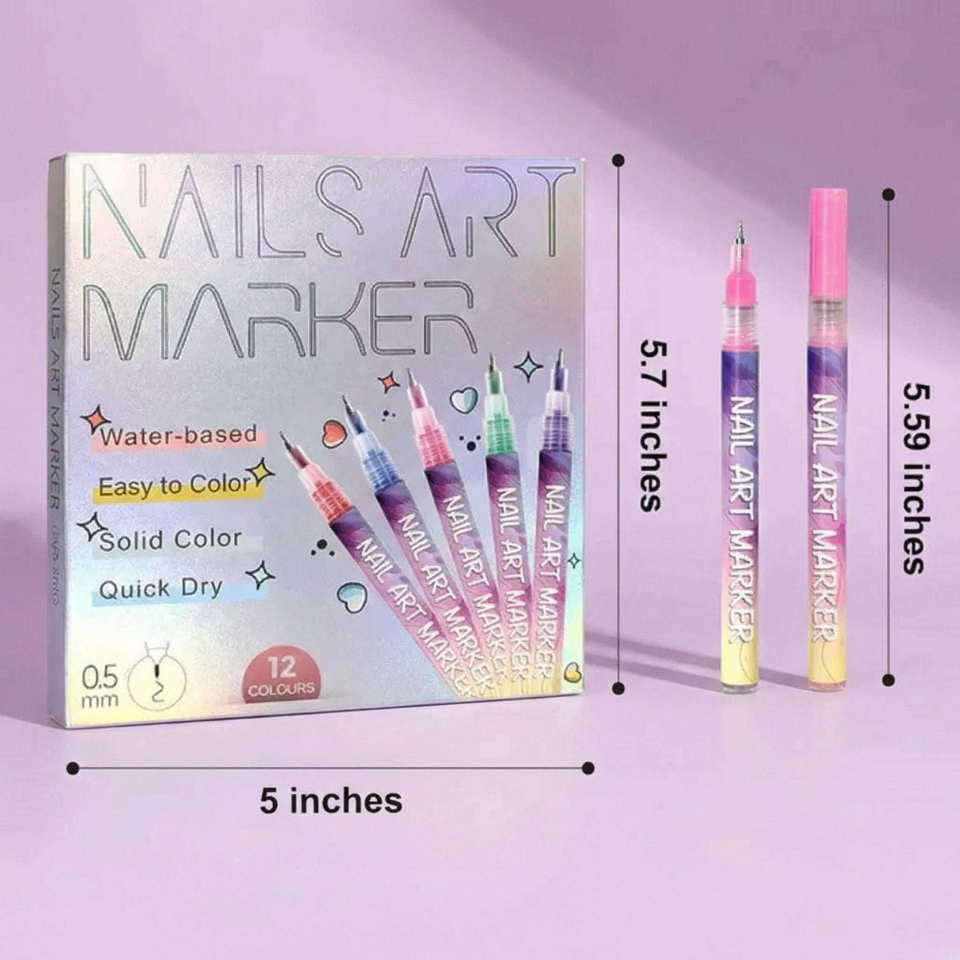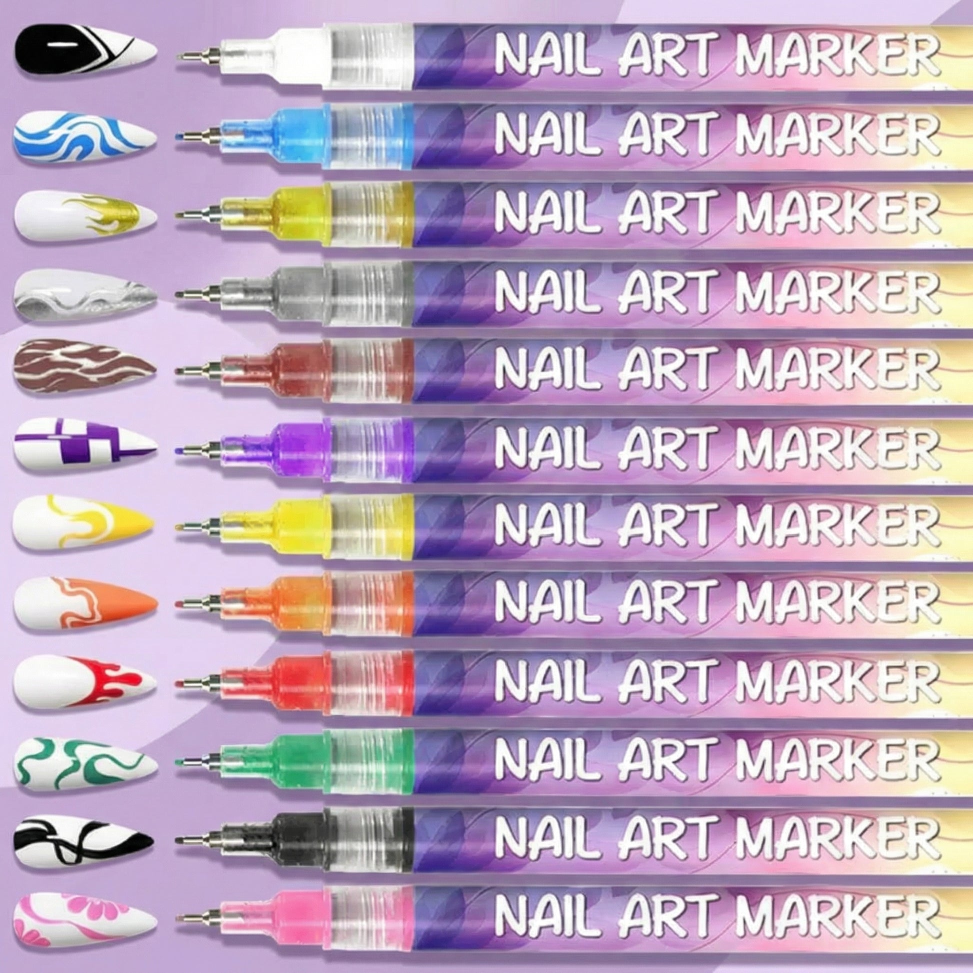Create salon-style nail designs at home with precision nail art pens in 12 vibrant colours. Perfect for bold looks or subtle details.